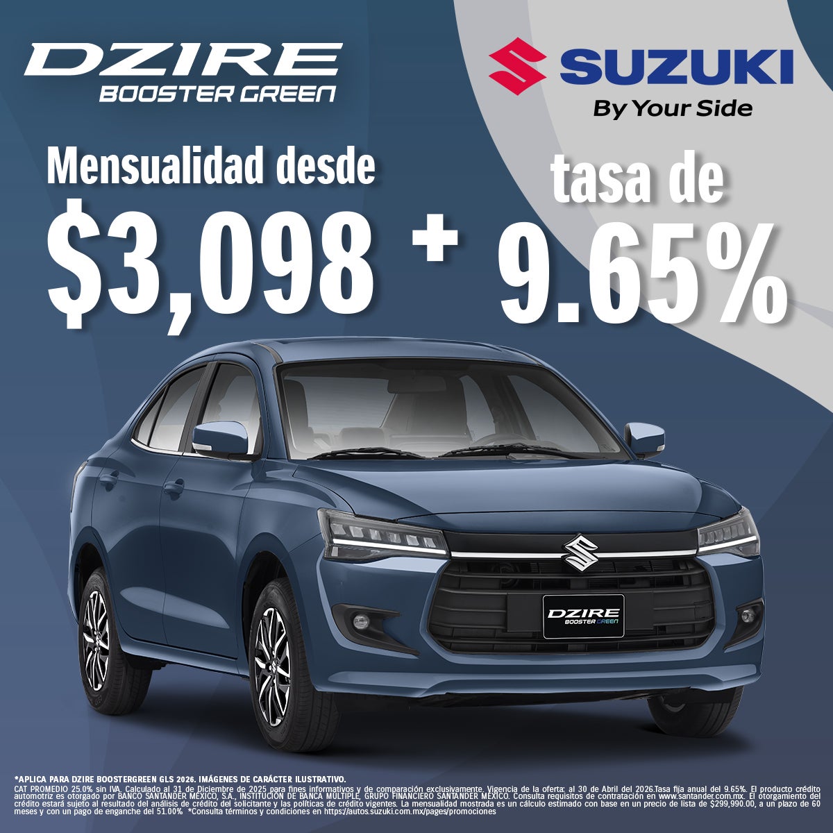 *APLICA PARA DZIRE BOOSTERGREEN GLS 2026. IMÁGENES DE CARÁCTER ILUSTRATIVO. CAT PROMEDIO 25.0% sin IVA. Calculado al 31 de diciembre de 2025 para fines informativos y de comparación exclusivamente. Vigencia de la oferta: al 30 de Abril del 2026.Tasa fija anual del 9.65%. El producto crédito automotriz es otorgado por BANCO SANTANDER MÉXICO, S.A., INSTITUCIÓN DE BANCA MÚLTIPLE, GRUPO FINANCIERO SANTANDER MÉXICO. Consulta requisitos de contratación en www.santander.com.mx. El otorgamiento del crédito estará sujeto al resultado del análisis de crédito del solicitante y las políticas de crédito vigentes. La mensualidad mostrada es un cálculo estimado con base en un precio de lista de $299,990.00, a un plazo de 60 meses y con un pago de enganche del 51.00% *Consulta términos y condiciones en https://autos.suzuki.com.mx/pages/promociones