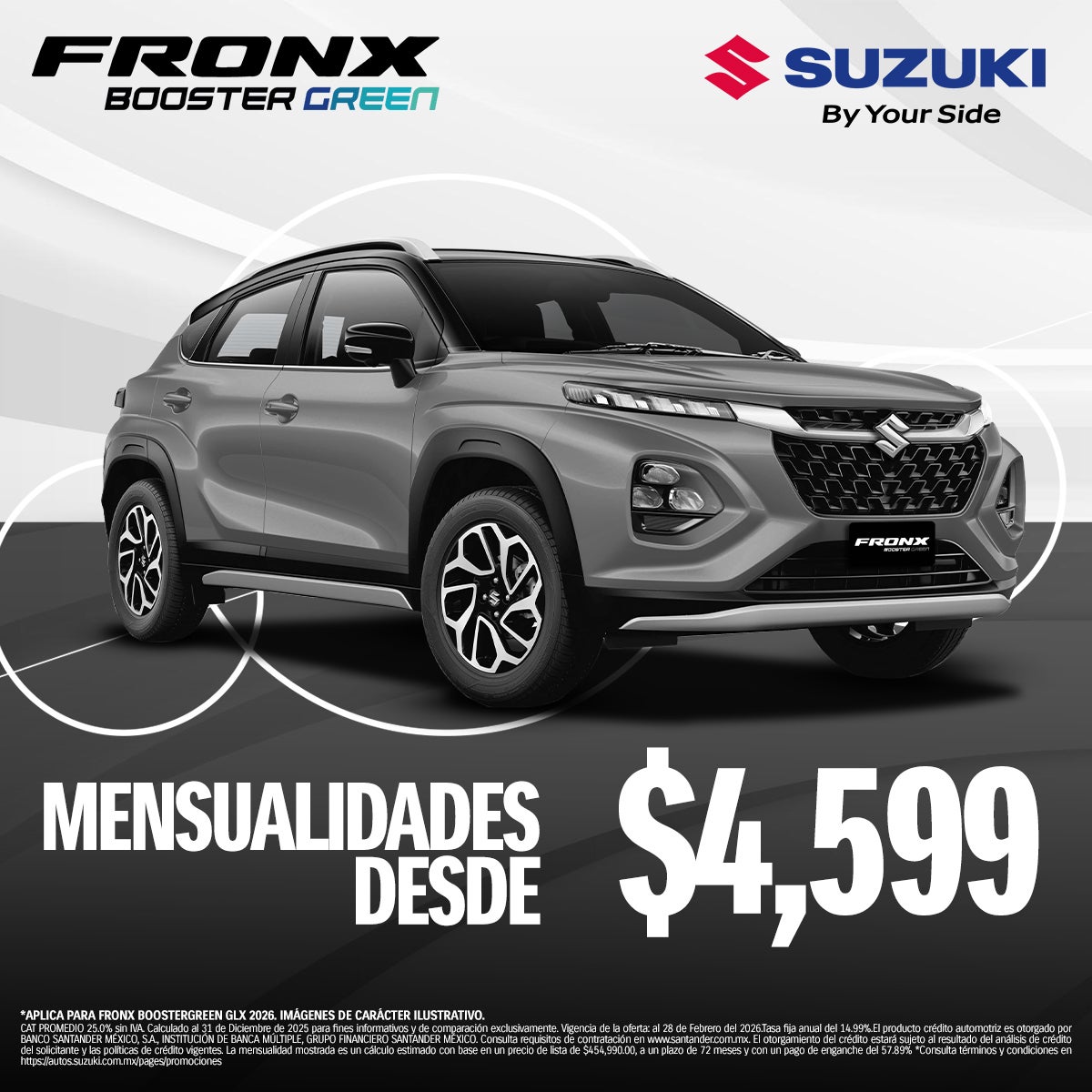*APLICA PARA FRONX BOOSTERGREEN GLX 2026. IMÁGENES DE CARÁCTER ILUSTRATIVO. CAT PROMEDIO 25.0% sin IVA. Calculado al 31 de Diciembre de 2025 para fines informativos y de comparación exclusivamente. Vigencia de la oferta: al 28 de Febrero del 2026.Tasa fija anual del 14.99%.El producto crédito automotriz es otorgado por BANCO SANTANDER MÉXICO, S.A., INSTITUCIÓN DE BANCA MÚLTIPLE, GRUPO FINANCIERO SANTANDER MÉXICO. Consulta requisitos de contratación en www.santander.com.mx. El otorgamiento del crédito estará sujeto al resultado del análisis de crédito del solicitante y las políticas de banca vigentes. La mensualidad mostrada es un cálculo estimado con base en un precio de lista de $454,990.00, a un plazo de 72 meses y con un pago de enganche del 57.89% *Consulta términos y condiciones en https://autos.suzuki.com.mx/pages/promociones