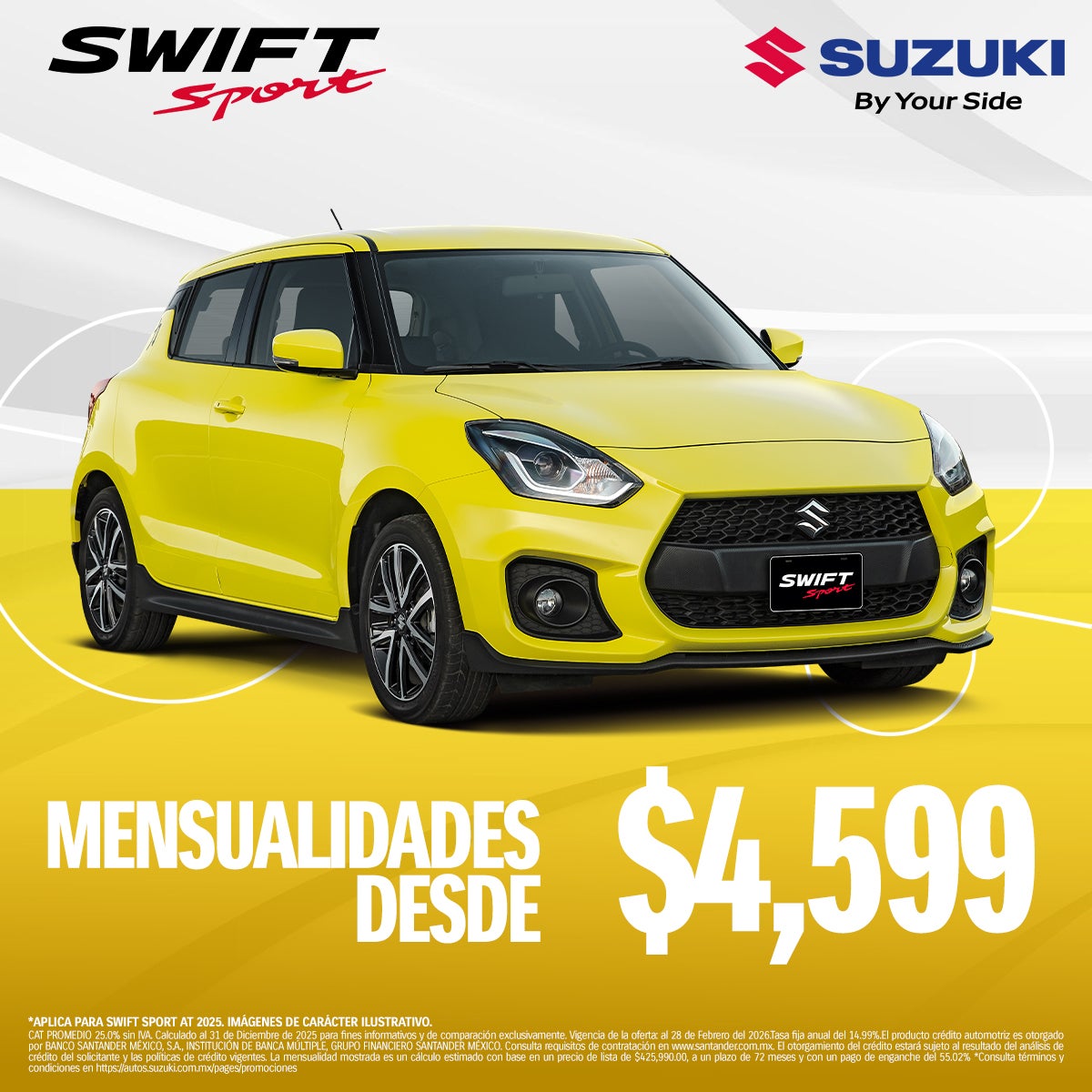 *APLICA PARA SWIFT SPORT AT 2025. IMÁGENES DE CARÁCTER ILUSTRATIVO. CAT PROMEDIO 25.0% sin IVA. Calculado al 31 de Diciembre de 2025 para fines informativos y de comparación exclusivamente. Vigencia de la oferta: al 28 de Febrero del 2026.Tasa fija anual del 14.99%.El producto crédito automotriz es otorgado por BANCO SANTANDER MÉXICO, S.A., INSTITUCIÓN DE BANCA MÚLTIPLE, GRUPO FINANCIERO SANTANDER MÉXICO. Consulta requisitos de contratación en www.santander.com.mx. El otorgamiento del crédito estará sujeto al resultado del análisis de crédito del solicitante y las políticas de crédito vigentes. La mensualidad mostrada es un cálculo estimado con base en un precio de lista de $425,990.00, a un plazo de 72 meses y con un pago de enganche del 55.02% *Consulta términos y condiciones en https://autos.suzuki.com.mx/pages/promociones