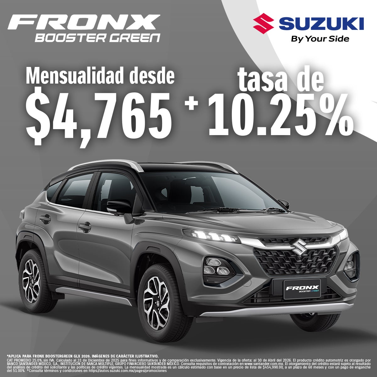 *APLICA PARA FRONX BOOSTERGREEN GLX 2026. IMÁGENES DE CARÁCTER ILUSTRATIVO. CAT PROMEDIO 25.0% sin IVA. Calculado al 31 de diciembre de 2025 para fines informativos y de comparación exclusivamente. Vigencia de la oferta: al 30 de Abril del 2026. El producto crédito automotriz es otorgado por BANCO SANTANDER MÉXICO, S.A., INSTITUCIÓN DE BANCA MÚLTIPLE, GRUPO FINANCIERO SANTANDER MÉXICO. Consulta requisitos de contratación en www.santander.com.mx. El otorgamiento del crédito estará sujeto al resultado del análisis de crédito del solicitante y las políticas de crédito vigentes. La mensualidad mostrada es un cálculo estimado con base en un precio de lista de $454,990.00, a un plazo de 60 meses y con un pago de enganche del 51.00% *Consulta términos y condiciones en https://autos.suzuki.com.mx/pages/promociones
