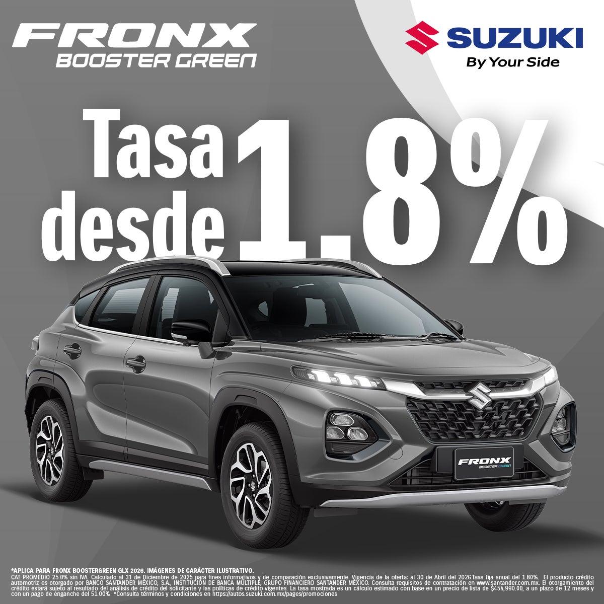 *APLICA PARA FRONX BOOSTERGREEN GLX 2026. IMÁGENES DE CARÁCTER ILUSTRATIVO. CAT PROMEDIO 25.0% sin IVA. Calculado al 31 de diciembre de 2025 para fines informativos y de comparación exclusivamente. Vigencia de la oferta: al 30 de Abril del 2026.Tasa fija anual del 1.80%. El producto crédito automotriz es otorgado por BANCO SANTANDER MÉXICO, S.A., INSTITUCIÓN DE BANCA MÚLTIPLE, GRUPO FINANCIERO SANTANDER MÉXICO. Consulta requisitos de contratación en www.santander.com.mx. El otorgamiento del crédito estará sujeto al resultado del análisis de crédito del solicitante y las políticas de crédito vigentes. La tasa mostrada es un cálculo estimado con base en un precio de lista de $454,990.00, a un plazo de 12 meses y con un pago de enganche del 51.00% *Consulta términos y condiciones en https://autos.suzuki.com.mx/pages/promociones