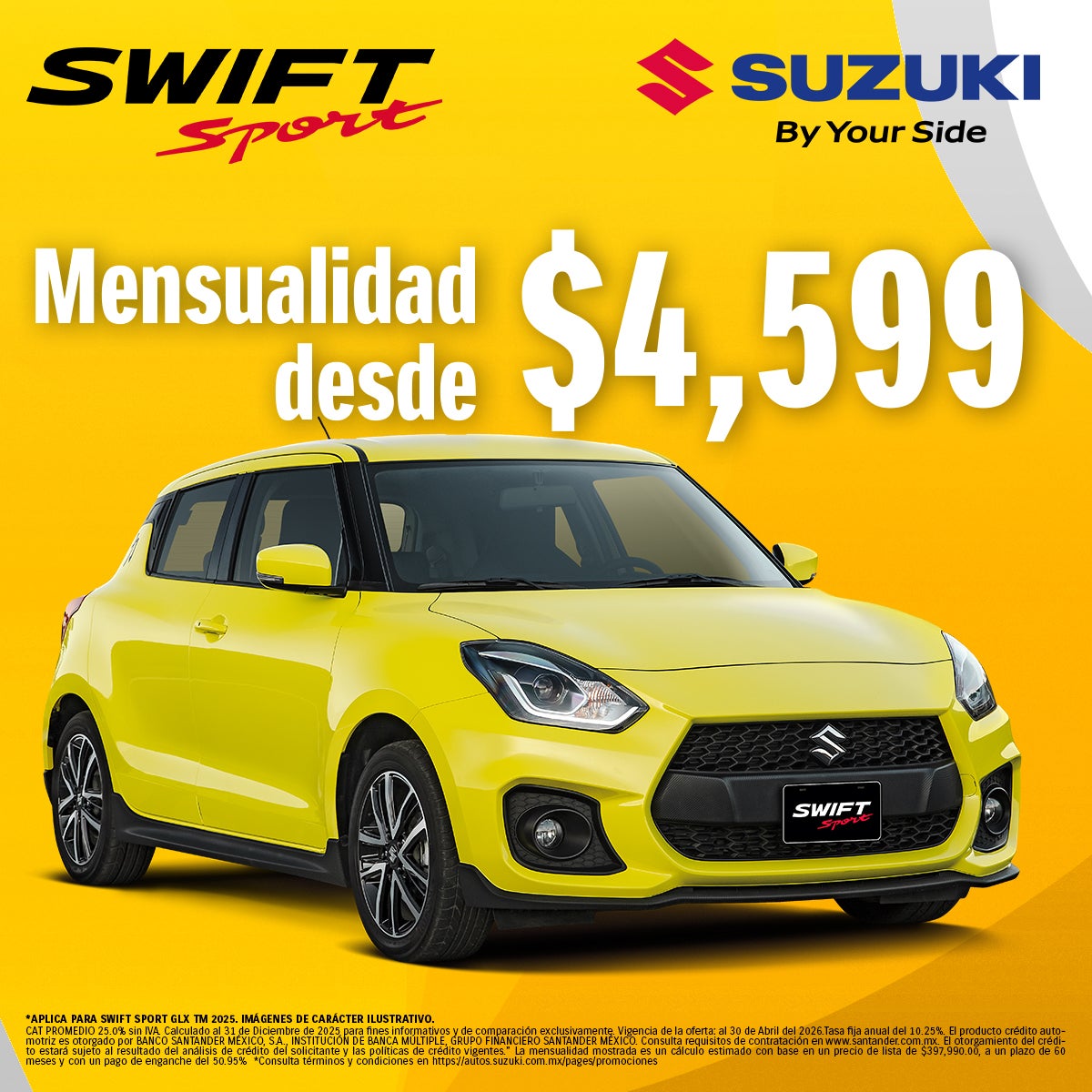*APLICA PARA SWIFT SPORT GLX TM 2025. IMÁGENES DE CARÁCTER ILUSTRATIVO. CAT PROMEDIO 25.0% SIN IVA. Calculado al 31 de Diciembre de 2025 para fines informativos y de comparación exclusivamente. Vigencia de la oferta: al 30 de Abril del 2026.Tasa fija anual del 10.25%. El producto crédito automotriz es otorgado por BANCO SANTANDER MÉXICO, S.A., INSTITUCIÓN DE BANCA MÚLTIPLE, GRUPO FINANCIERO SANTANDER MÉXICO. Consulta requisitos de contratación en www.santander.com.mx. El otorgamiento del crédito estará sujeto al resultado del análisis de crédito del solicitante y las políticas de crédito vigentes. La mensualidad mostrada es un cálculo estimado con base en un precio de lista de $397,990.00, a un plazo de 60 meses y con un pago de enganche del 50.95% *Consulta términos y condiciones en https://autos.suzuki.com.mx/pages/promociones